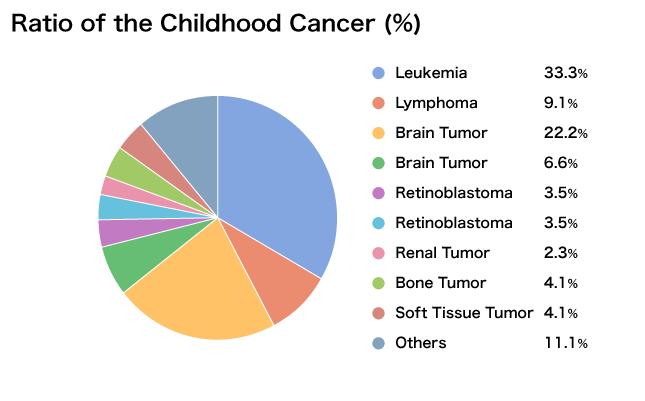 There are few types of childhood cancer, including leukemia, brain tumor, neuroblastoma, malignant lymphoma, and nephroblastoma also known as Wilms tumor. Leukemia accounts for 40% of all types of pediatric cancer, and brain tumor accounts for 20% (National Cancer Research Institute Japan).